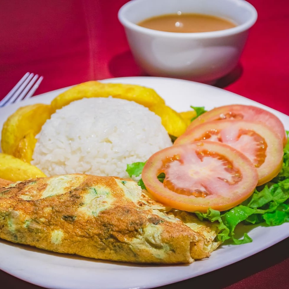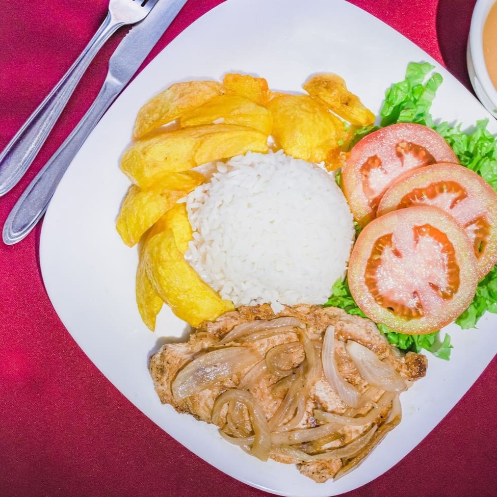 Filé de alcatra grelhado, arroz, dois ovos, fritas e legumes na manteiga