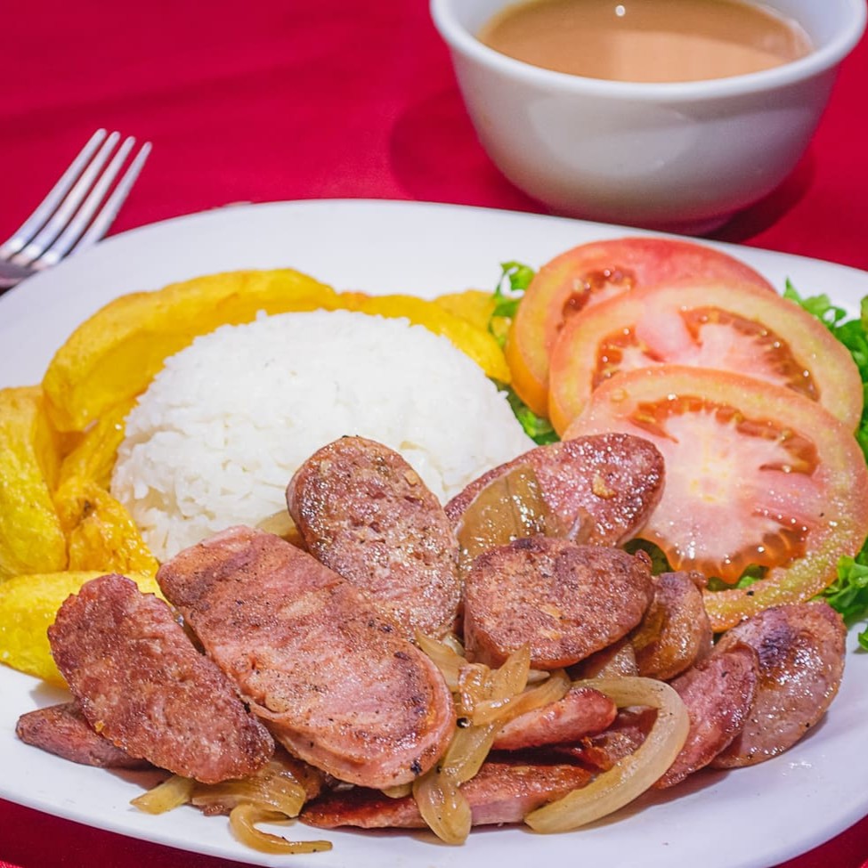Arroz, tutu de feijão, couve, ovo, lombo grelhado, linguiça.