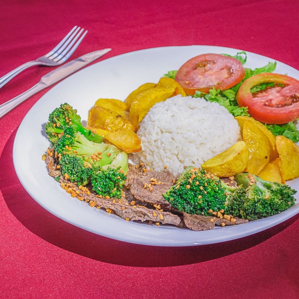 Alcatra grelhada com brócolis e alho frito, arroz, pure de batatas e salada