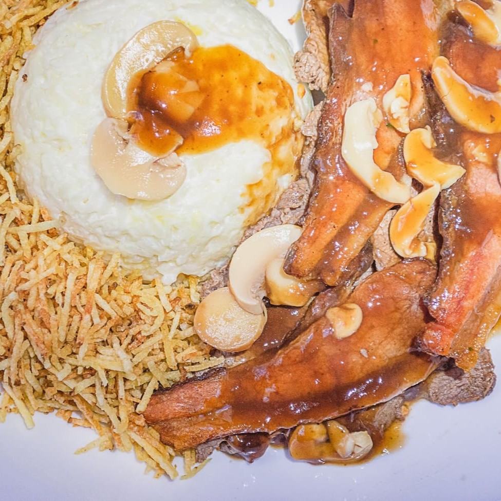 Alcatra grelhada com bacon e molho madeira, arroz piamontese e fritas