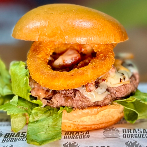 Burger artesanal 150g, cheddar cremoso, bacon, onion rings crocantes e barbecue