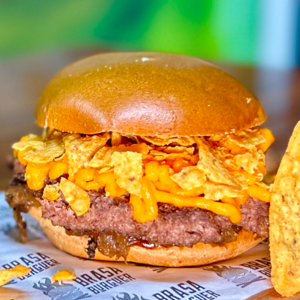 Burger artesanal 150g, cheddar cremoso, cebola caramelizada, Doritos crocante e barbecue.