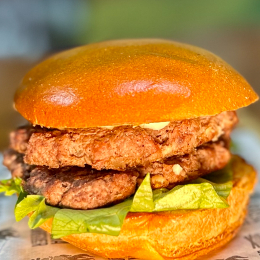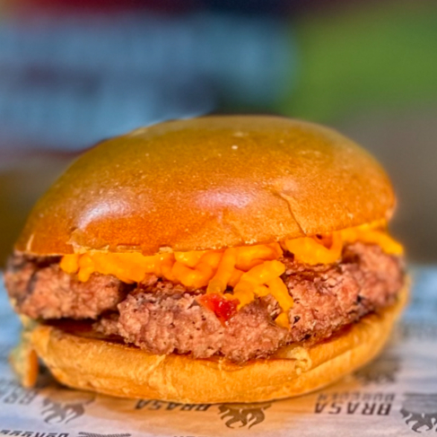 Frango empanado crocante, alface fresca, molho especial brasa no pão artesanal