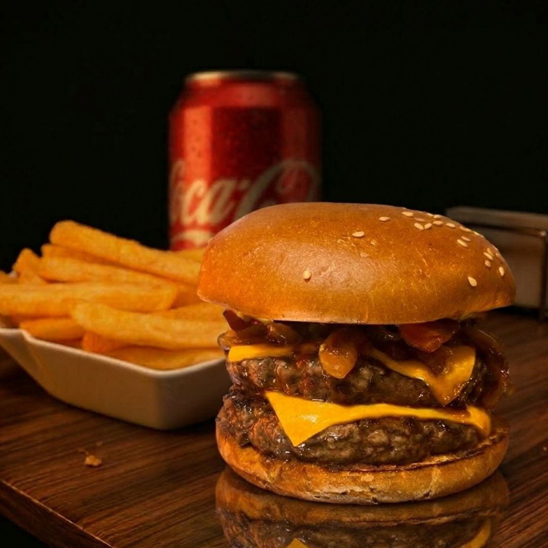 1 Monstro Burguer ( Pão de Brioche , Duplo Blend Bovino 120g ,Cheddar , Bacon, Maionese Verde da Casa , Cebola Caramelizada ) , Acompanha Fritas + Coca-Cola 350 ml