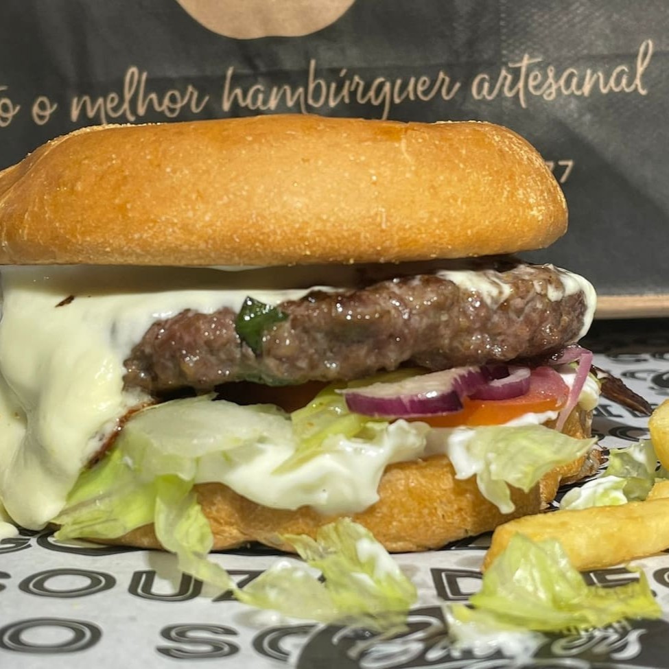 Pão brioche, carne bovina, mussarela e maionese da casa.