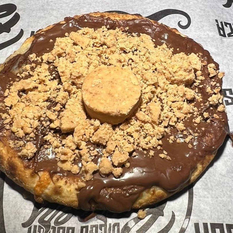 Molho de tomate, mussarela, presunto, calabresa, Catupiry, bacon, milho, oregano, cebola e azeitonas verdes sem caroço