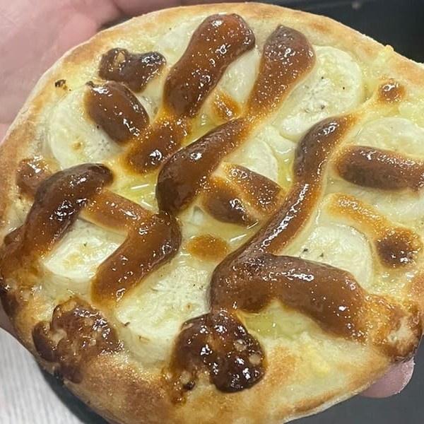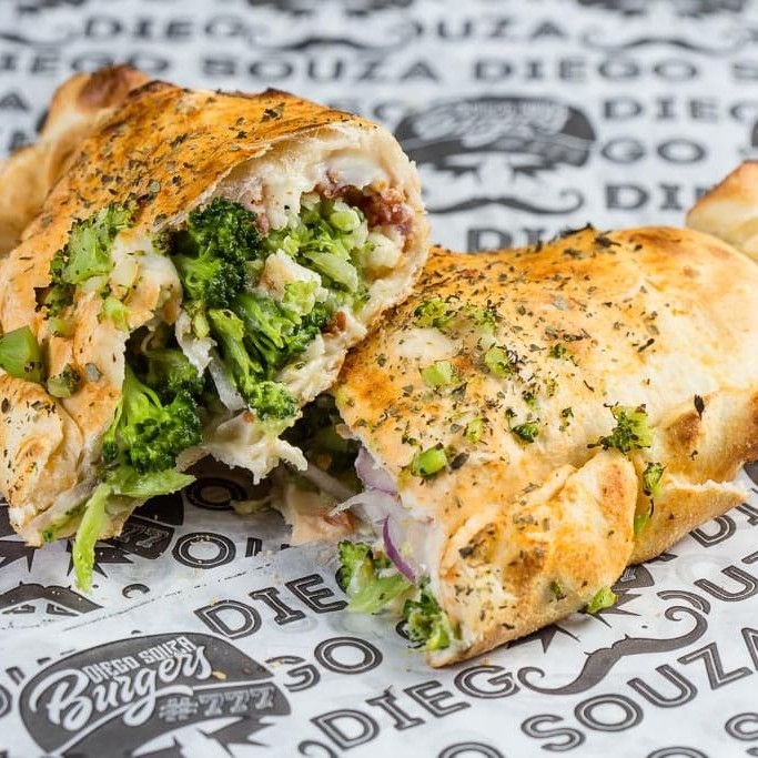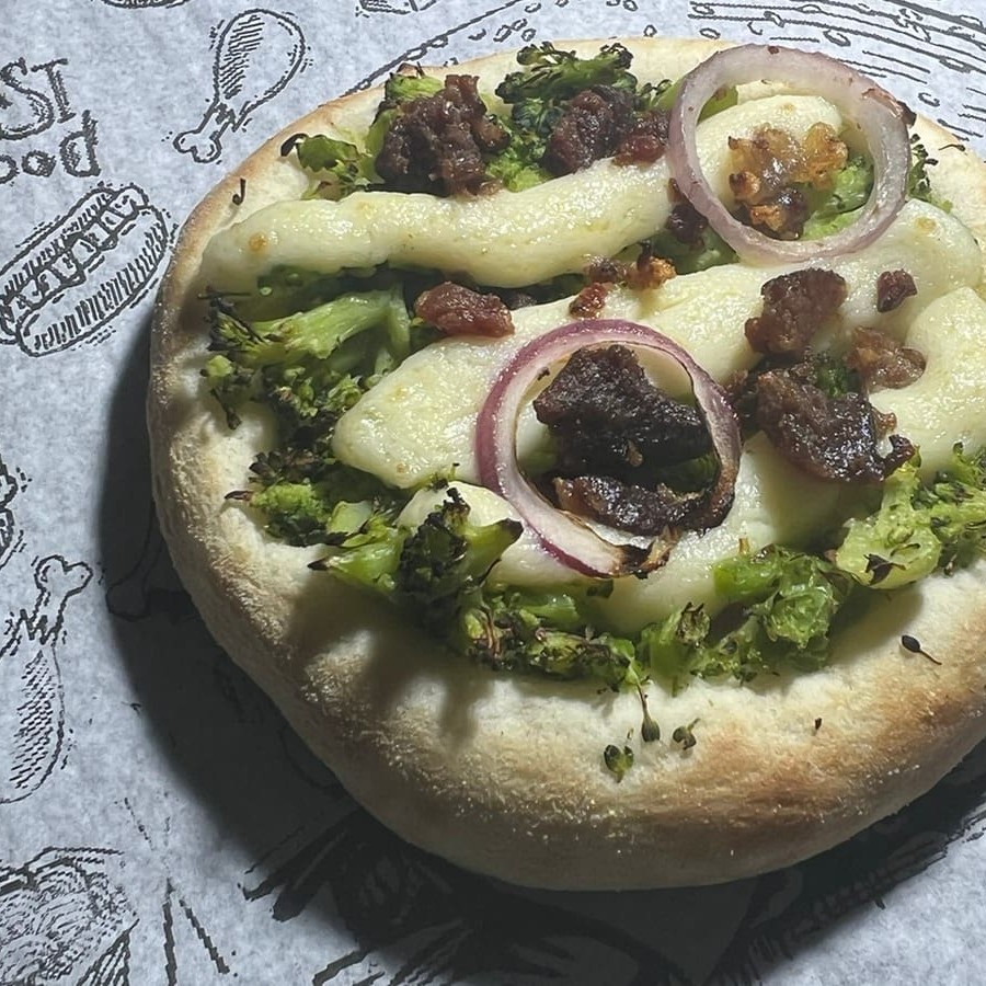 Mussarela, brócolis ao alho, bacon, Catupiry, cebola, orégano, e azeitonas verdes sem caroço.