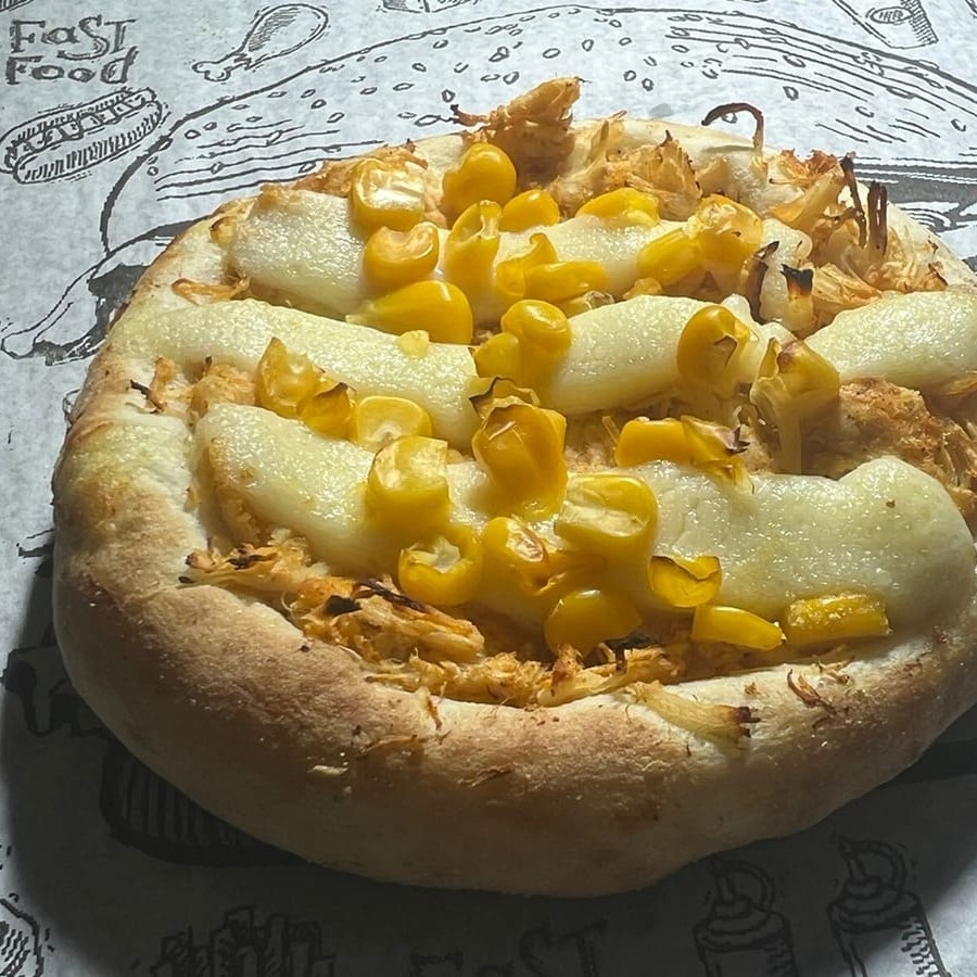 Molho de tomate, mussarela, frango desfiado, bacon, Catupiry e azeitonas verdes sem caroço