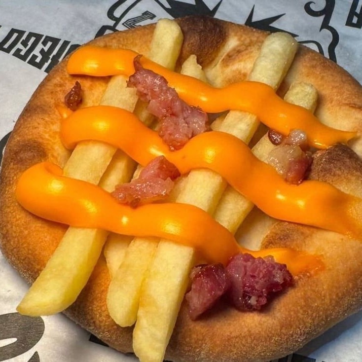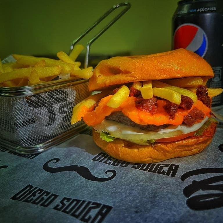 Pão brioche ,carne bovina, cebola, bacon, cheddar, alface, tomate, batata frita(dentro do lanche) e maionese da casa.