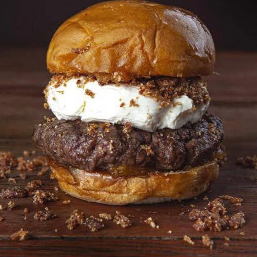 Pão brioche, maionese defumada, alface americana, tomate, cebola, carne, cream cheese e bacon