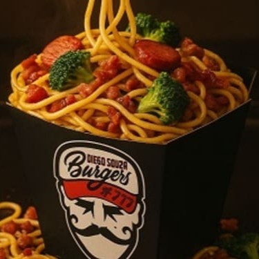 Macarrão, bacon, calabresa, cebola, brócolis, molho shoyo, milho. Serve muito bem uma pessoa.