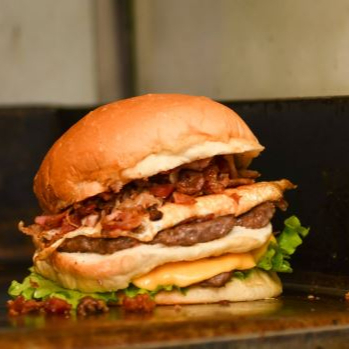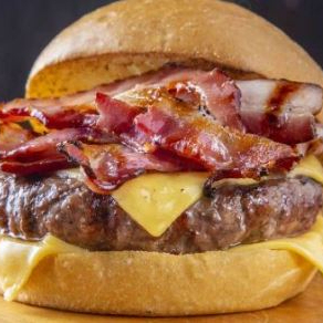 Pão de hamburguer, hamburguer, frango, maionese, milho,alface, tomate, frango, bacon, catupiry, presunto e queijo.
