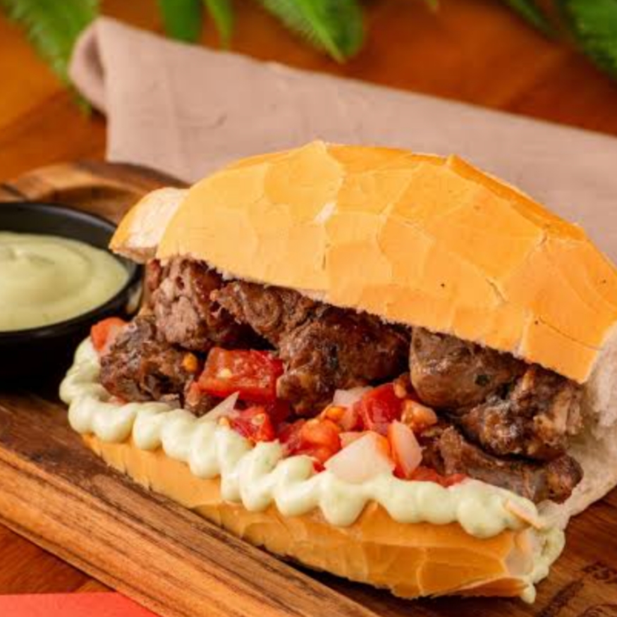 Pão frances, contra filé, cebola, maionese, milho, tomate, e queijo.