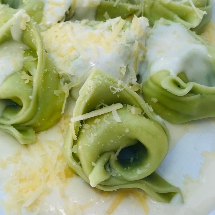 Delicioso Tortelone de Quatro Queijos. Esta obra-prima gastronômica é cuidadosamente preparada para atingir um ponto ligeiramente mais al dente, proporcionando uma textura irresistivelmente firme e satisfatória a cada garfada. O rico e complexo sabor dos quatro queijos se funde maravilhosamente com a massa, resultando em uma experiência culinária absolutamente inesquecível.