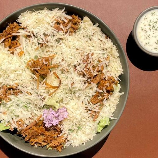Salada da casa com rúcula, alface americano, lagarto desfiado, parmesão ralado e molho de mostarda e mel. Opção Vegetariana: Pedir sem a proteína.