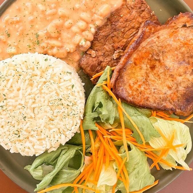 Arroz, Feijão, Salada, Legumes e bife bovino grelhado.