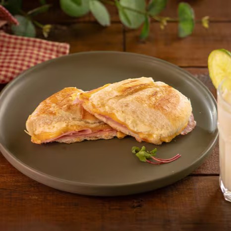 Pão Francês na manteiga, requeijão cremoso, presunto e queijo prato.