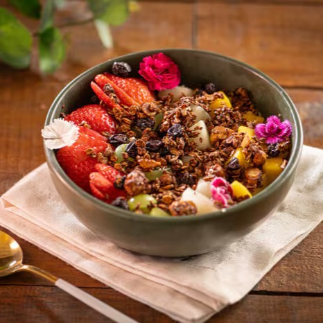 Frutas da estação com granola doce da casa. Consulte as opções de frutas disponíveis.