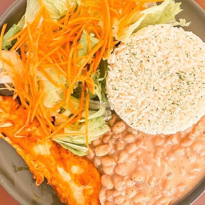 Arroz, Feijão, Salada, Legumes e Frango grelhado.