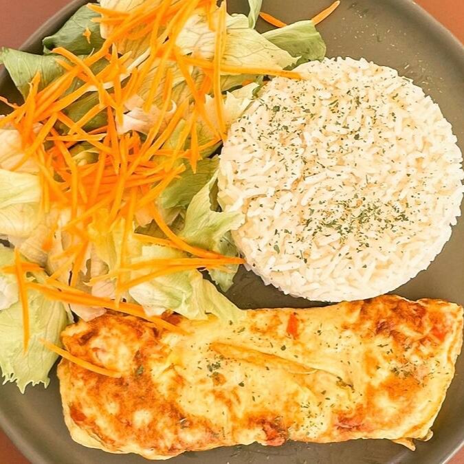 Arroz, Feijão, Salada, Legumes e omelete com tomate.