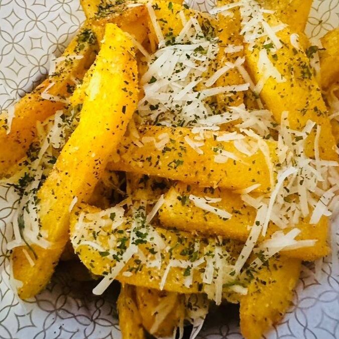 Batata Frita com tempero especial da casa, coberta de parmesão.