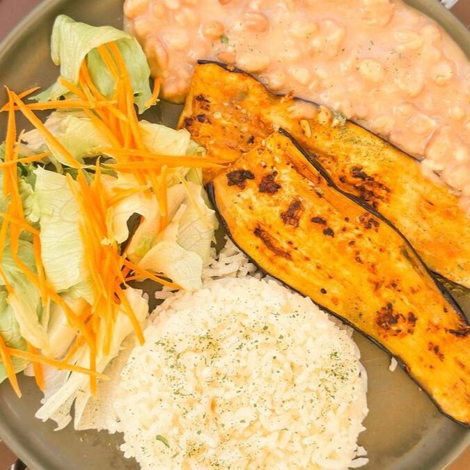 Arroz, Feijão, Salada, Legumes e beringela grelhada.