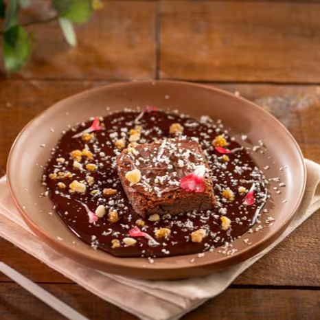 Brownie servido com calda quente de chocolate e raspas de castanha.