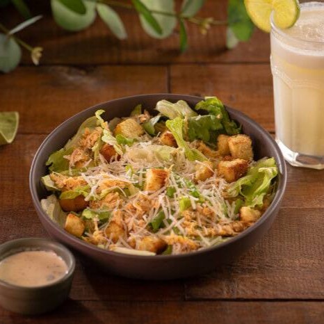 Alface americana, frango desfiado, parmesão, molho Caesar e croutons dourados no azeite. Opção Vegetariana: Pedir sem a proteína.