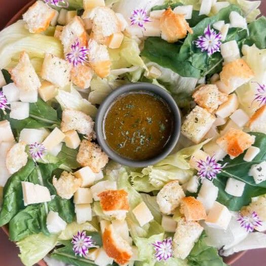 Folhas frescas, palmito, queijo meia cura, croutons dourados no azeite e molho de mostarda e mel. Opção Vegetariana.