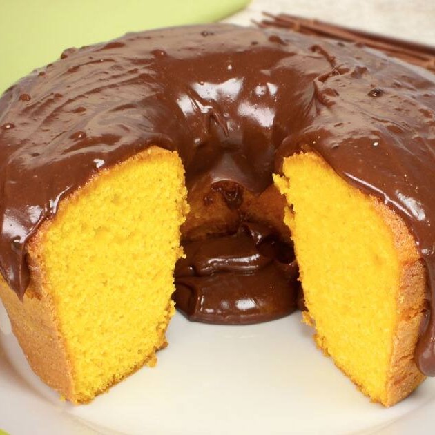 Bolo caseiro de cenoura com cobertura de chocolate.