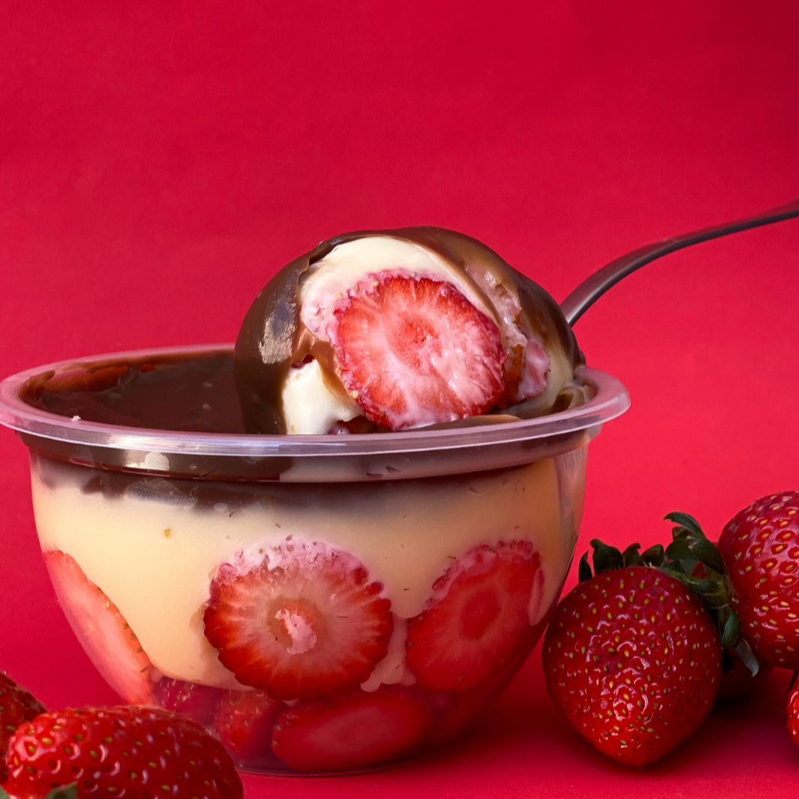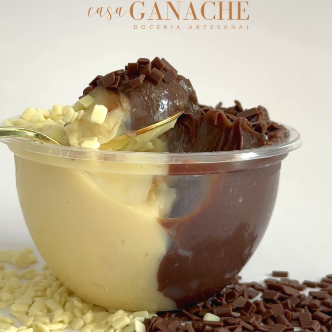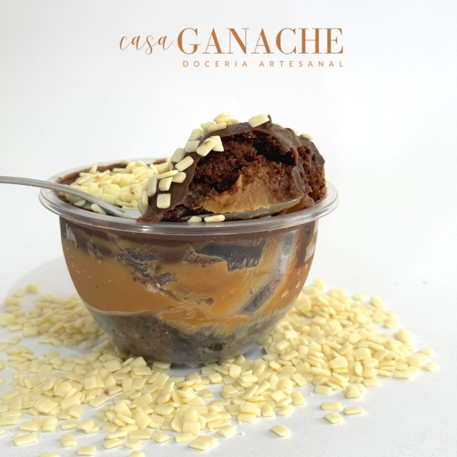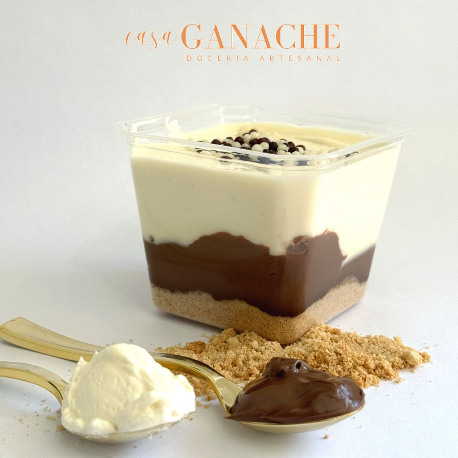morango, brownie, brigadeiro branco, mousse de chocolate branco e um delicioso pudim por cima