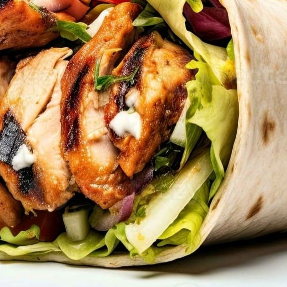 Pão pita recheada com carne de frango temperado , alface