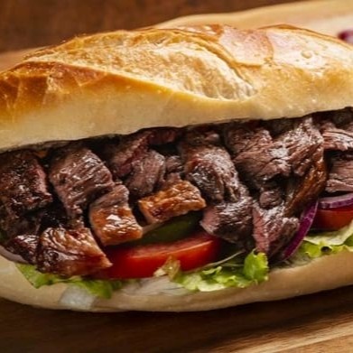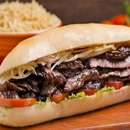 2 unidades de pão francês recheado com carne bovina ( fraldinha) tomate, alface, cebola caramelizada