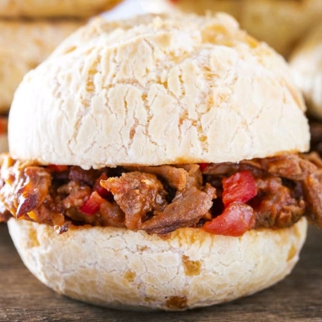 Pão de queijo recheado com carne suína e, mussarela