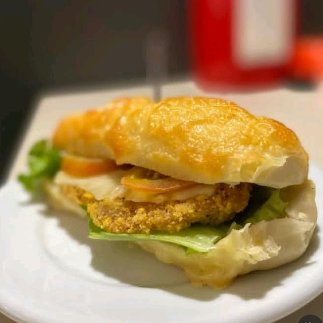 Baguete , com frango empanado, mussarela, queijo, tomate, alface