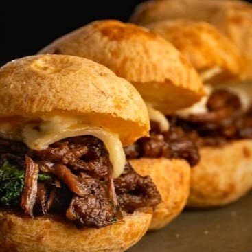 Pão de queijo recheado com fraldinha assada e queijo mussarela