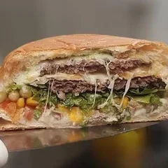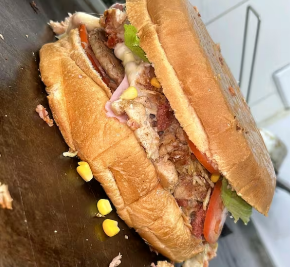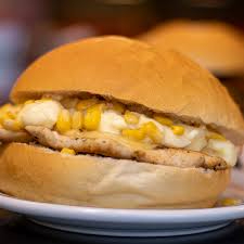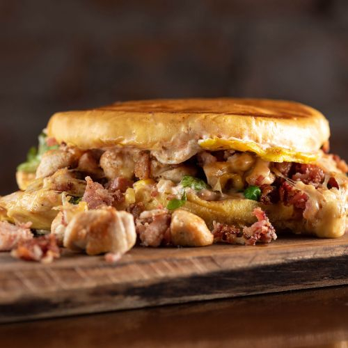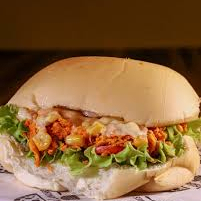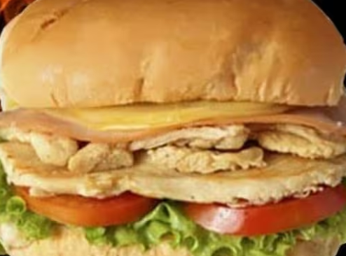 FIlé de frango em cubos, bacon, ovo, mussarela, presunto, catupiry, milho, batata palha, alface e tomate, feito no pão de hamburguer grande.