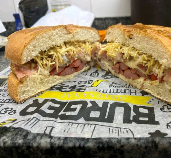 Hamburguer, bacon, mussarela, presunto, catupiry, milho, alface e tomate, feito no pão de hamburguer