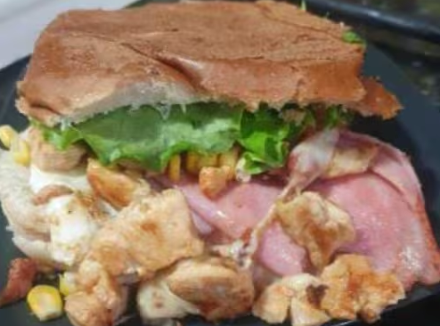 (LANCHE PEQUENO)Hamburguer, filé de frango em cubos, ovo, mussarela, presunto milho, alface e tomate, feito no pão de hamburguer pequeno.