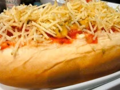 2 salsichas, mussarela, catupiry, milho e batata palha. Feito no pão de hamburguer pequeno.