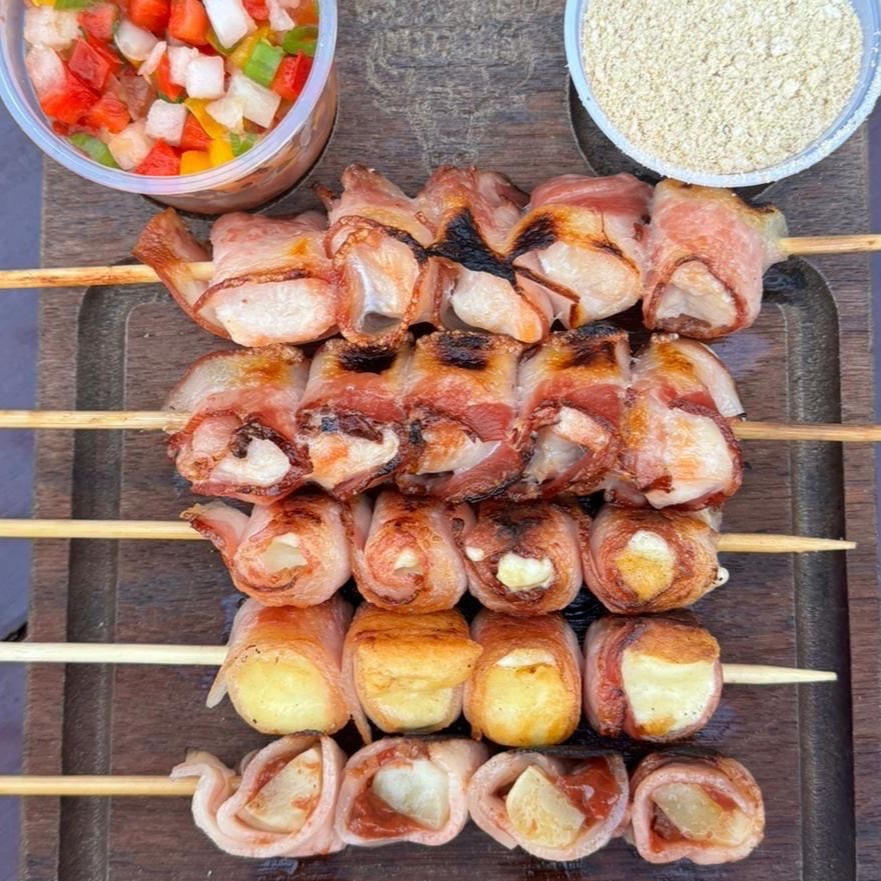 Acompanha farofa caseira. Espetinho de medalhão de queijo nozinho premium com goiabada e enrolado no bacon da casa! Tudo no conforto da sua casa. Todos os Nossos espetinhos são feitos com as carnes do nosso açougue próprio, nunca congelados, sempre frescos preparados na hora. _ _ #Espetinho #Espeto #Cerveja #Carne #Coração #Frango #Queijocoalho #Churrasco #Bebidas #Espetinhos #Entregagratis #Entregarapida #Porco #Pernil #Panceta #Kafta #Comida #Delicioso #Refri #Suco
