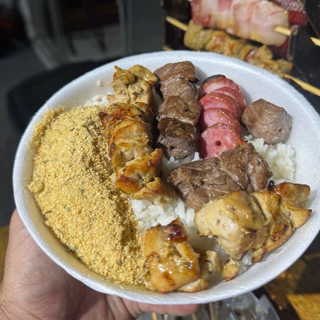 Sua Marmita já acompanha **Arroz, Feijão e Farofa!** Além disso, Escolha 2 carnes e também escolha 1 acompanhamento Extra, montando assim sua marmita preferida de almoço! :) * Nao efetuamos troca de arroz ou feijao, bem como retirar um ou outro. #marmita #almoco #espetinho #espeto #frango #carne #porco #linguica #churrasco