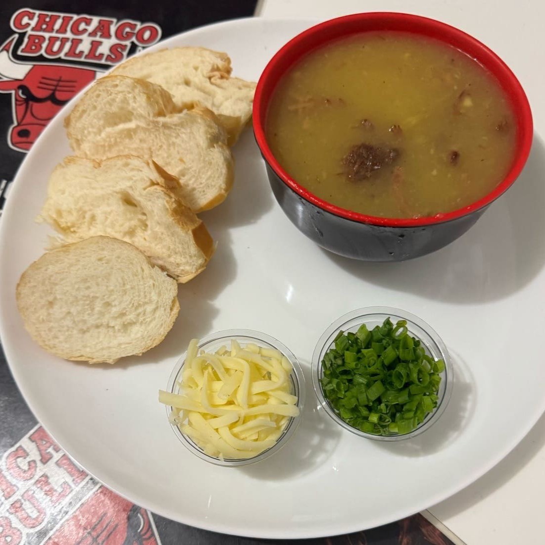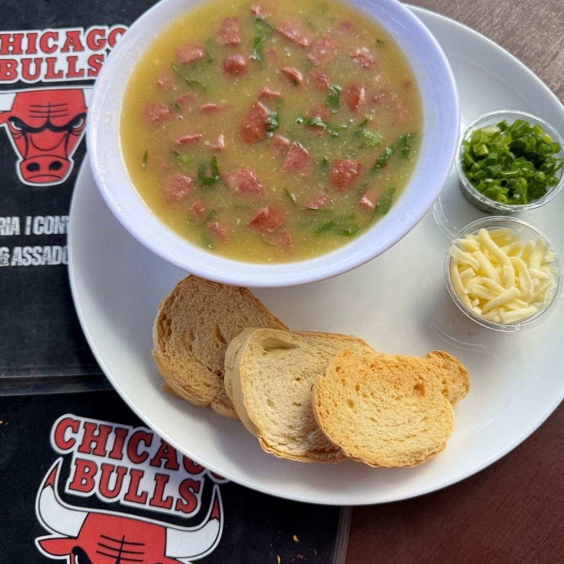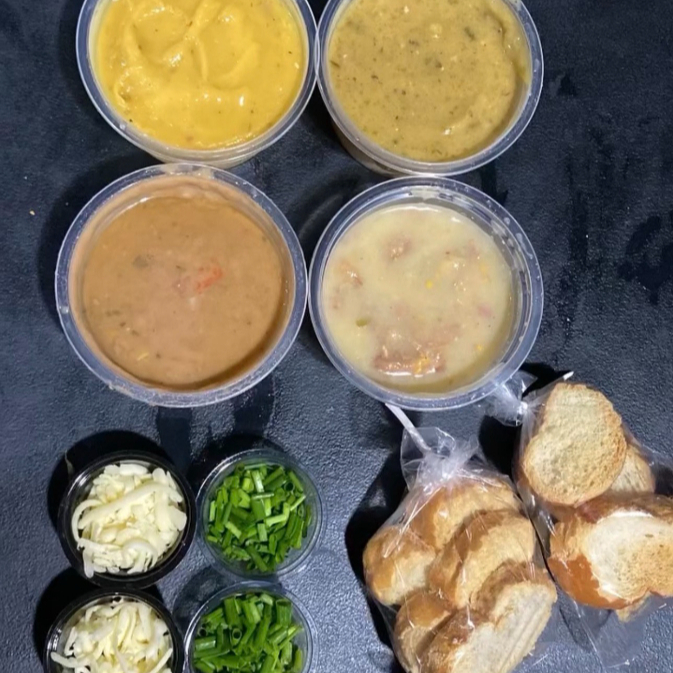 4 Caldos de 175ml cada (700 ml total) sendo: - Caldo de Mandioquinha com frango - Caldo Verde com calabresa - Caldo de Mandioca c/ costela - Caldo de Feijão com bacon e Calabresa Feitos 100% aqui na Chicago Bulls! -> Acompanha queijo ralado, cebolinha picada e torradas. #caldo #costela #mandioca #quente #inverno