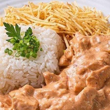 Tamanho da marmita 550 gramas. Nosso strogonoff de frango caseiro, feito diariamente. Servido com arroz e batata palha crocante. (contem champignon)