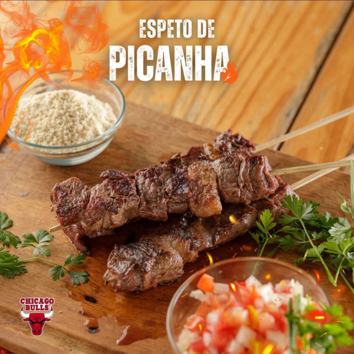 Acompanha: Farofa! A carne mais saborosa do boi agora é espetinho especial da Chicago Bulls! #picanha #carne #espeto #espetinho #espetinhos #saboroso #delicia #farofa #vinagrete #chicago #chicagobulls #top