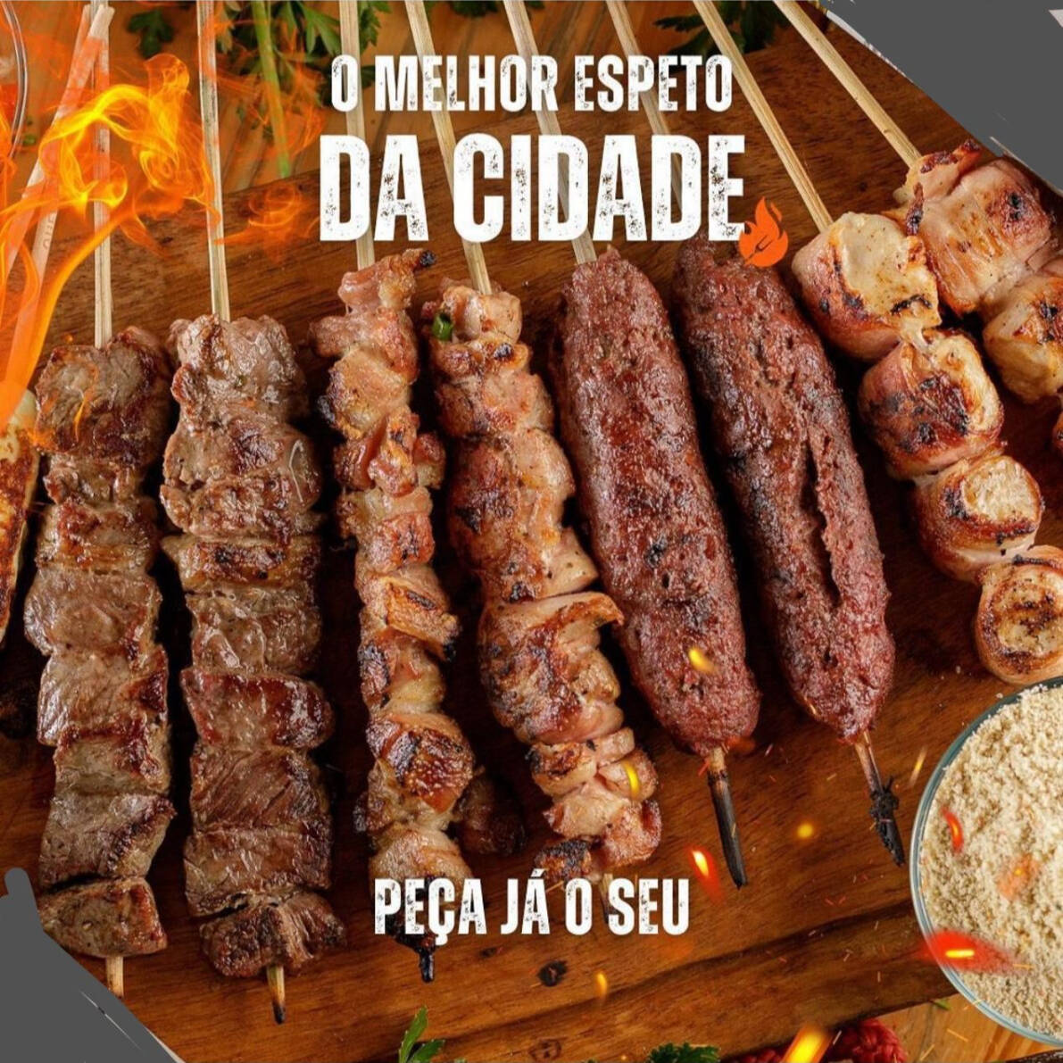 - 10 Espetinhos de sua escolha! :D :D - 2 Acompanhamentos de Sua Escolha - Acompanha Farofa Caseira Grátis! - Acompanha Bebida Grátis de sua Escolha! #combo #espeto #espetinhos #espetinho #frango #porco #pernil #gratis #promocao #economico #economia #acougue #fresquinho #vinho #agua #gratis #carne #barato