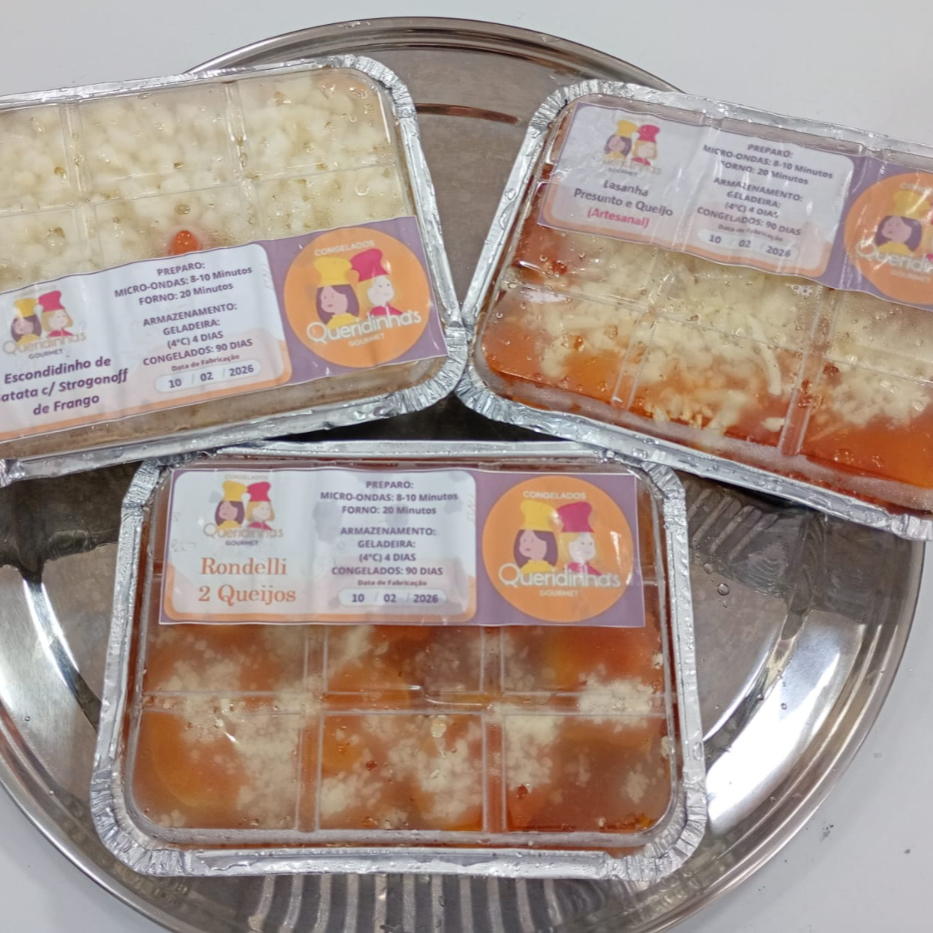 Arroz com Brócolis: 128gr, creme de milho: 120gr, tiras de frango com cebola roxa: 120gr