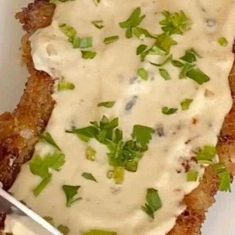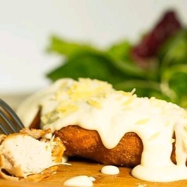 Filé Empanado com Molho Branco, Queijo e Orégano.