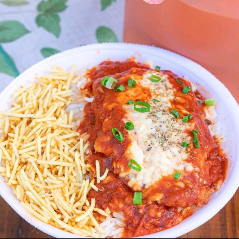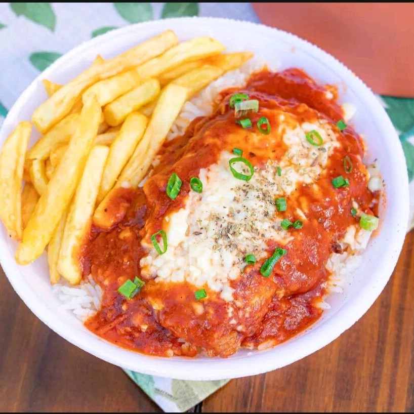 Filé Frango á Parmegiana acompanhado de Arroz branco, Feijão com Caldo, Duas Guarnições e Salada do Dia.