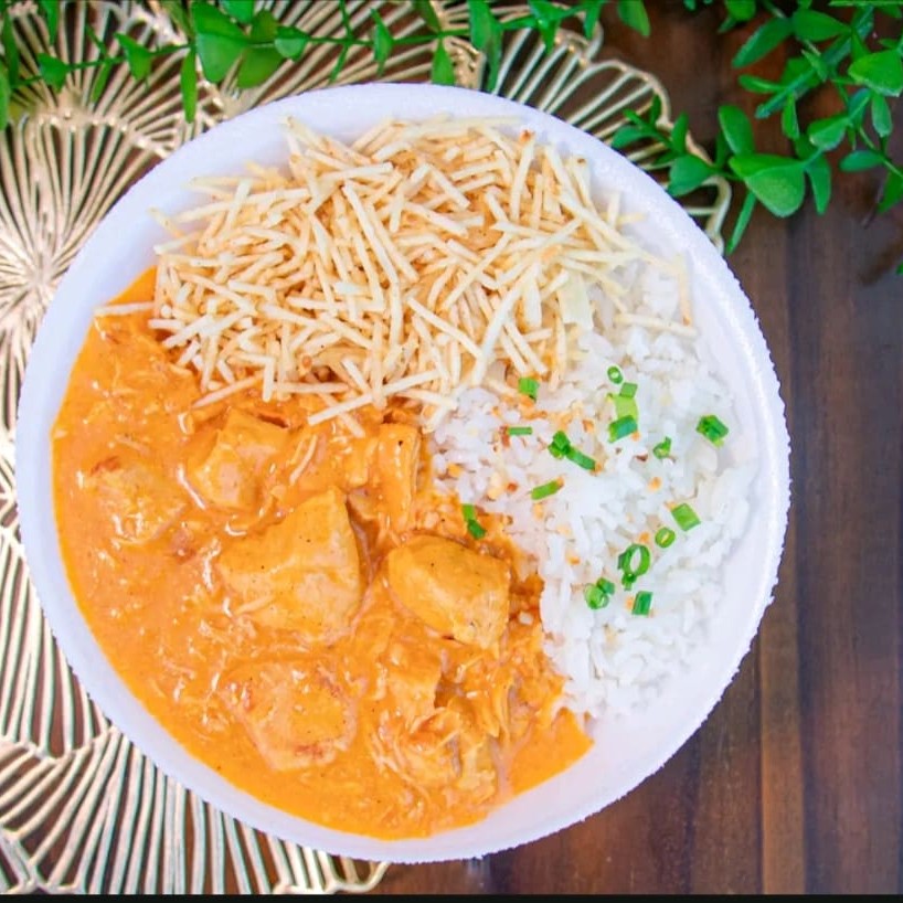 Strogonoff de Frango acompanhado de Arroz branco, Batata Palha.